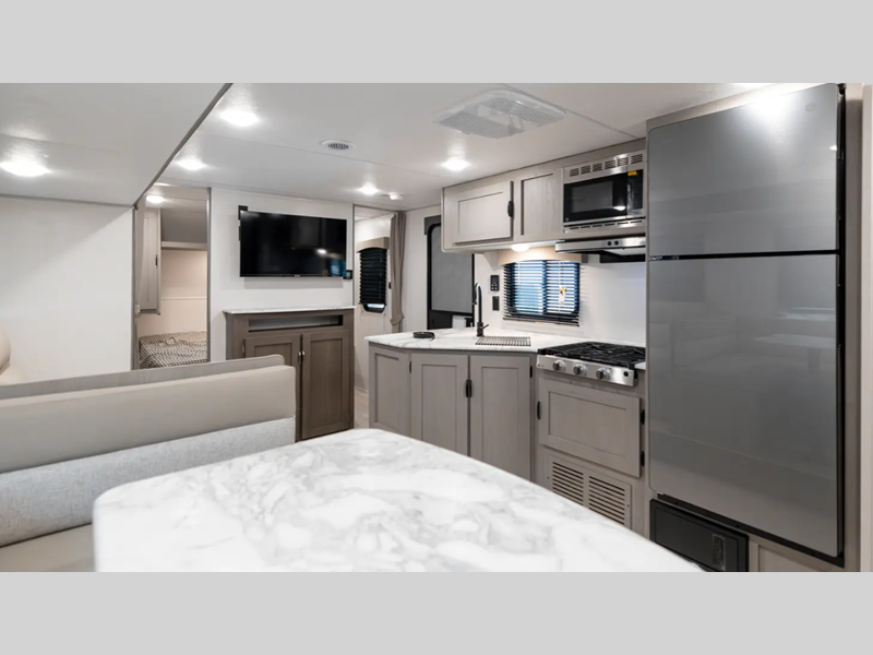 Sleeps 5 Slides 1 Length 30 ft 9 in Ext Width 8 ft Ext Height 10 ft Hitch Weight 740 lbs GVWR 7740 lbs Dry Weight 5868 lbs Cargo Capacity 1872 lbs Fresh Water Capacity 40 gals Grey Water Capacity 69 gals Black Water Capacity 32 gals Furnace BTU 30000 btu Available Beds RV Queen Refrigerator Type 12 Volt Refrigerator Size 10 cu ft Cooktop Burners 3 Shower Size 40" x 24" Number of Awnings 1 Water Heater Type Tankless On Demand AC BTU 13500 btu Awning Info 21' Power with LED Light Strip & Adj. Legs Axle Count 2 Washer/Dryer Available Yes Shower Type Standard Similar Floorplans