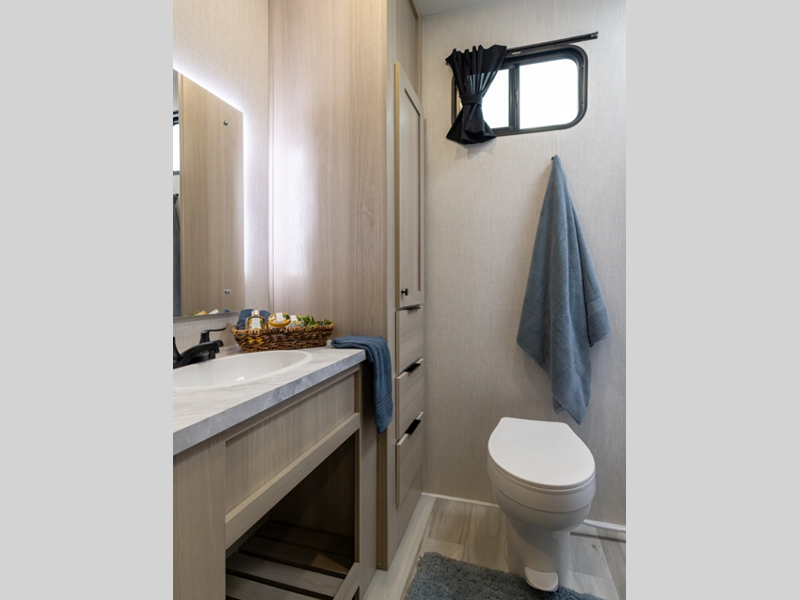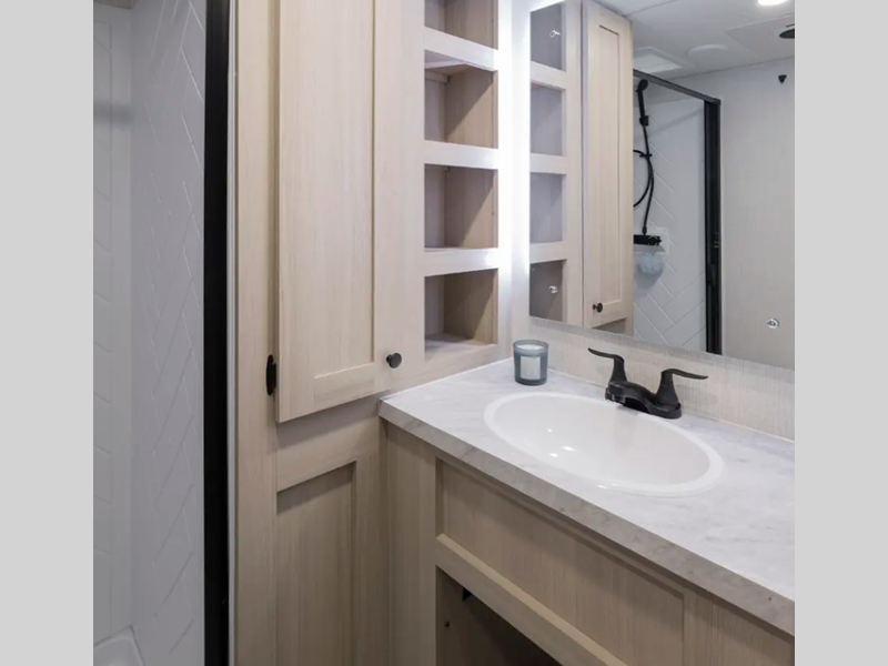 Each model is constructed with a vacuum bonded, welded aluminum structure, along with a PVC roof membrane, residential fiberglass insulation, and many durable construction materials. You will love the oversized opening windows in the living room, the walk-in shower in the bath, and the residential backsplash in the kitchen. The Climate Package helps extend your camping season and the Expedition Package includes many hassle-free amenities such as an outdoor shower, heavy duty slam latch baggage doors, and 4-point auto leveling!