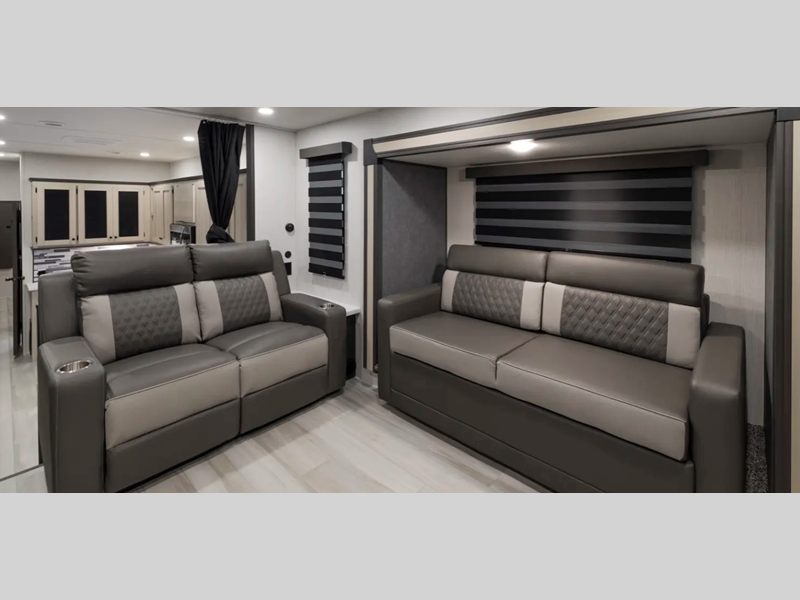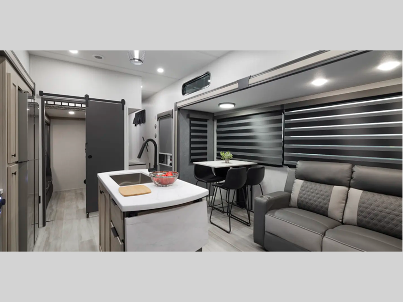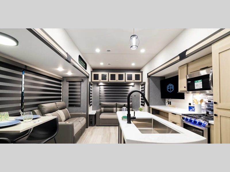 Sleeps 5 Slides 4 Length 43 ft 3 in Ext Width 8 ft Ext Height 13 ft 6 in Hitch Weight 2150 lbs GVWR 14908 lbs Dry Weight 12208 lbs Cargo Capacity 2700 lbs Fresh Water Capacity 60 gals Grey Water Capacity 114 gals Black Water Capacity 76 gals Furnace BTU 35000 btu Number Of Bunks 3 Available Beds King Refrigerator Type 12V Refrigerator Size 16 cu ft Number of Awnings 1 LP Tank Capacity 20 lbs Water Heater Type On Demand Tankless AC BTU 18000 btu TV Info LR LED TV Awning Info 19' Power Axle Count 2 Washer/Dryer Available Yes Number of LP Tanks 2 Shower Type Standard Electrical Service 50 amp Similar Floorplans