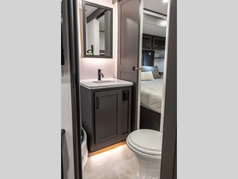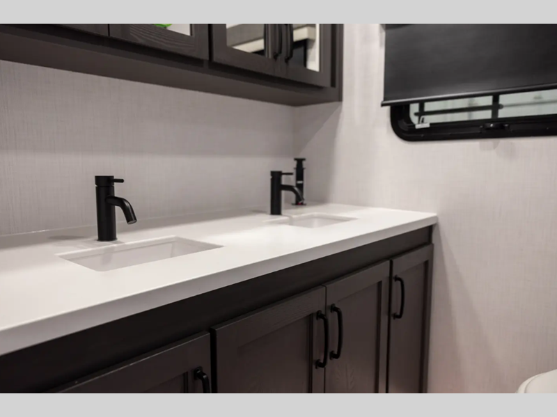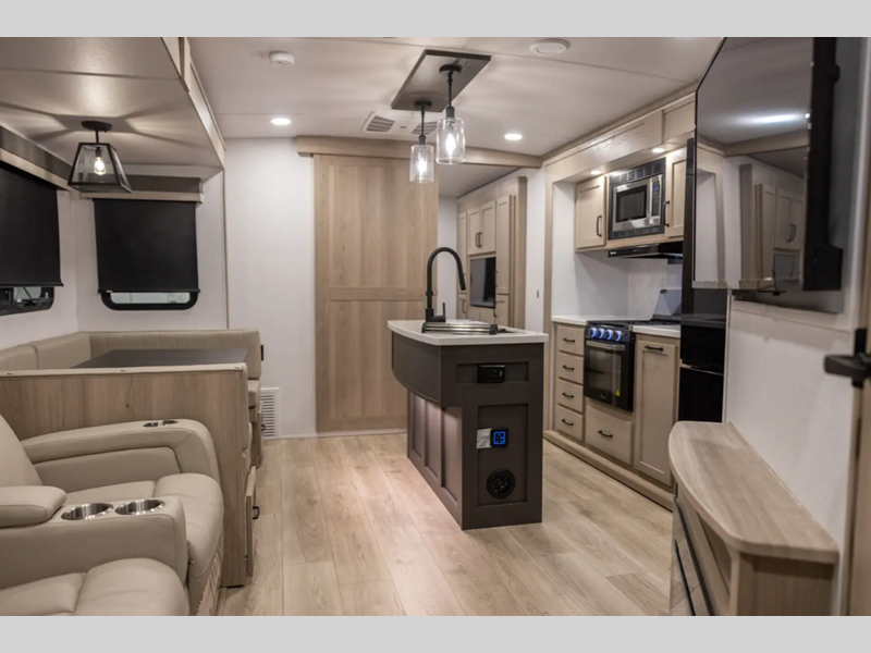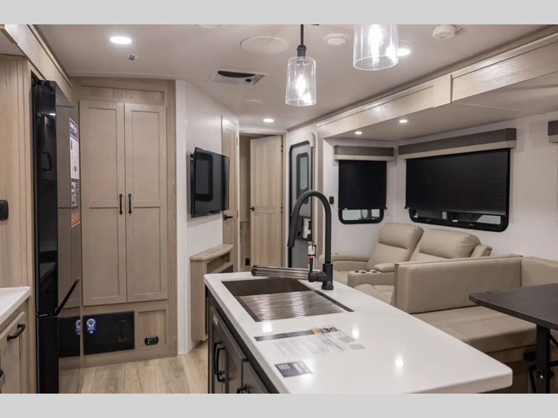 Outside, you'll find a power awning with an adjustable rain dump and LED lighting, backup camera pre, Keyed Alike locks, plus many more conveniences. The enclosed underbelly will help extend your camping season, and you can enjoy your RV for years thanks to the durable construction materials, like the radiant foil insulation and 5/8" plywood tongue and groove subfloor. Each fifth wheel and travel trailer also includes lino flooring in all slides, aluminum dinette, bed and bunk, plus solid surface kitchen countertops.