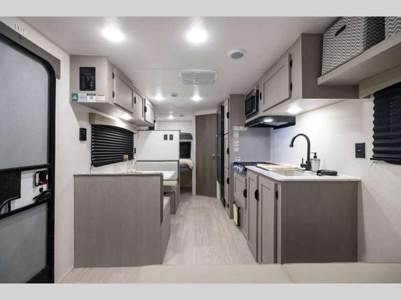 Sleeps 8 Length 29 ft 3 in Ext Width 8 ft Ext Height 11 ft Hitch Weight 450 lbs GVWR 7450 lbs Dry Weight 4769 lbs Cargo Capacity 2681 lbs Fresh Water Capacity 40 gals Grey Water Capacity 32 gals Black Water Capacity 32 gals Furnace BTU 20000 btu Number Of Bunks 2 Available Beds RV Queen Refrigerator Type 12 Volt Refrigerator Size 10 cu ft Shower Size 24" x 36" Number of Awnings 1 Water Heater Type On Demand Tankless AC BTU 13500 btu Awning Info 15' Power with LED Light Strip & Adj. Legs Axle Count 2 Shower Type Tub/Shower Combo Similar Floorplans