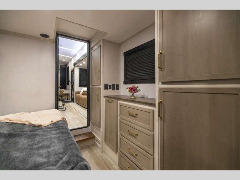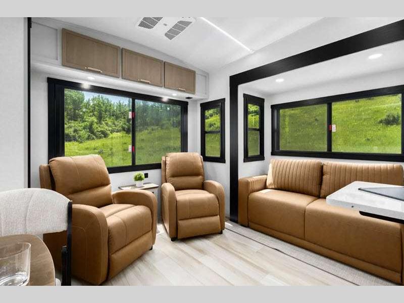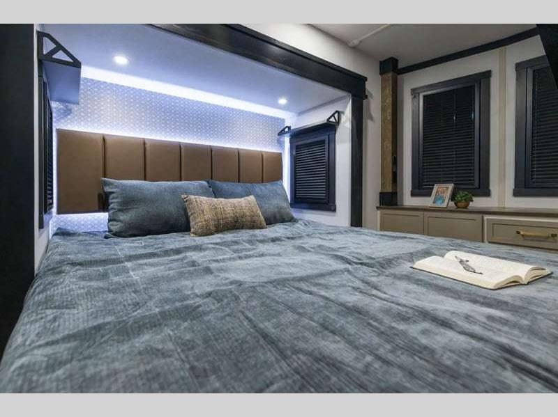 - Full-Profile Front Cap with HUGE Functional Wardrobe (378FL Uses Panoramic Windshield in-place-of Wardrobe)