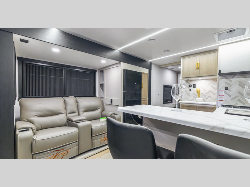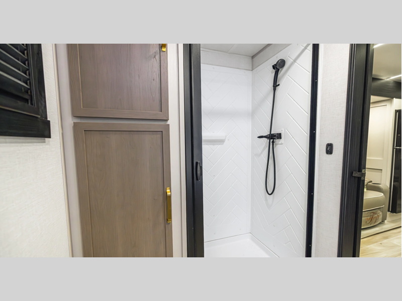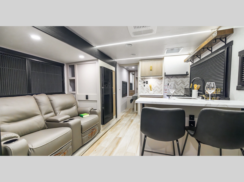 Sleeps 5 Slides 1 Length 34 ft Ext Width 8 ft Ext Height 10 ft 10 in Hitch Weight 725 lbs Dry Weight 6758 lbs Cargo Capacity 2767 lbs Fresh Water Capacity 49 gals Grey Water Capacity 62 gals Black Water Capacity 32 gals Available Beds Queen with Versa Tilt Refrigerator Type 12V Black Refrigerator Size 10 cu ft Cooktop Burners 3 Shower Size 30" x 36" Number of Awnings 1 Water Heater Type On Demand Tankless AC BTU 18000 btu TV Info LR 40" LED Smart TV Awning Info w/LED Lights Axle Count 2 Washer/Dryer Available Yes Shower Type Walk-In Shower Similar Floorplans