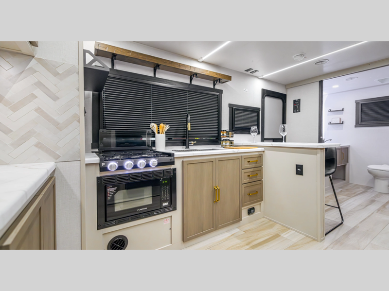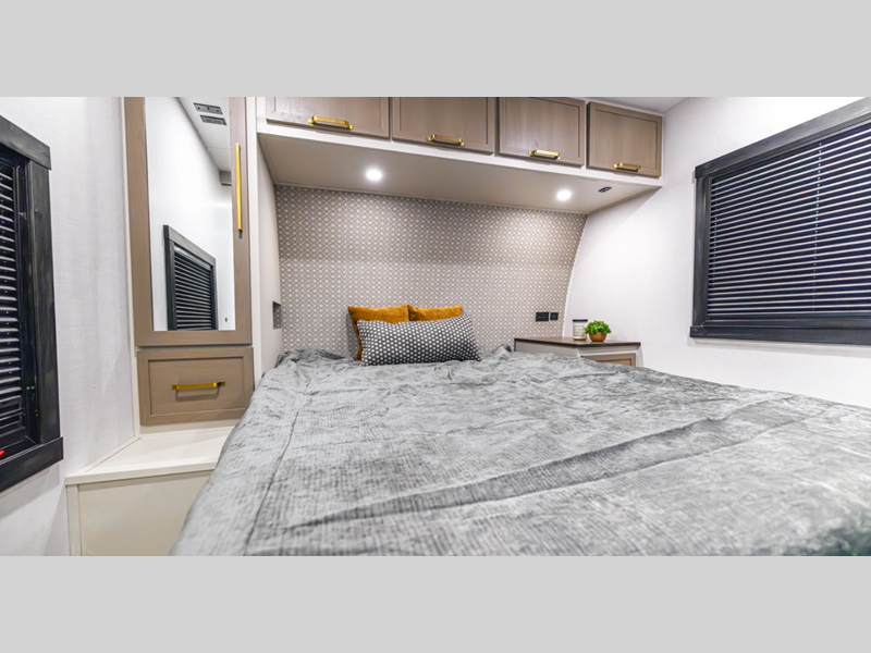 Each model is built with laminated "Aluma Frame" sidewalls and floor with block foam insulation for added durability. There is a power tongue jack with an LED docking light, along with an outside shower, and an extra large pass-thru storage for camp gear. You'll also enjoy the included Elevated Value Package that features conveniences such as square windows with built-in shades, 60K BTU On-Demand tankless water heater, and Maxxis radial tires.