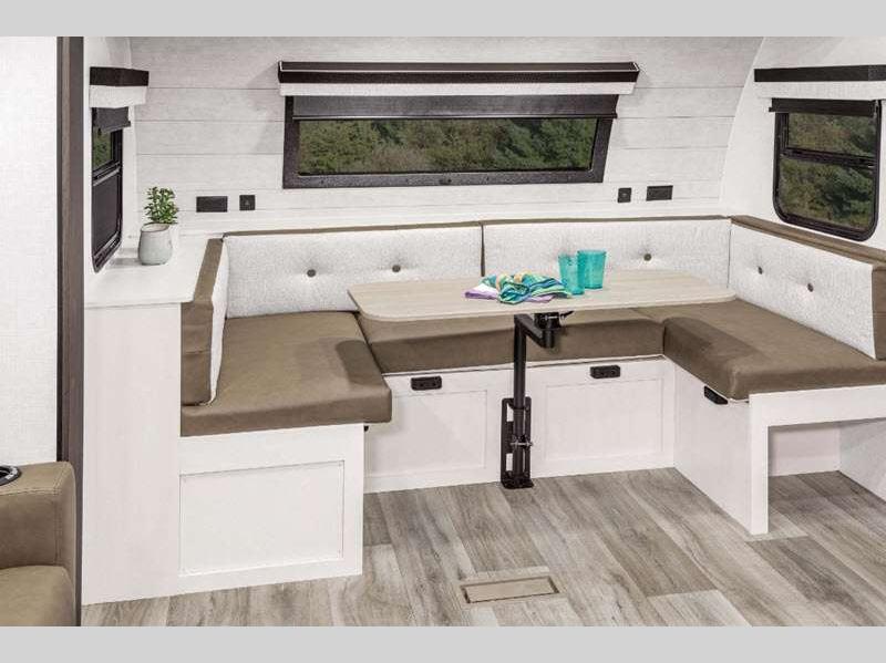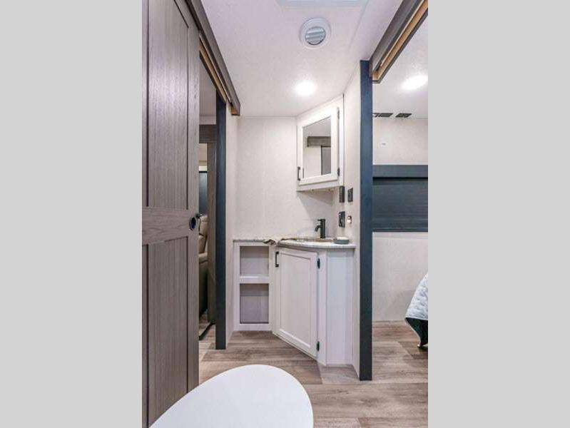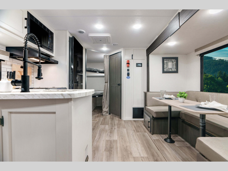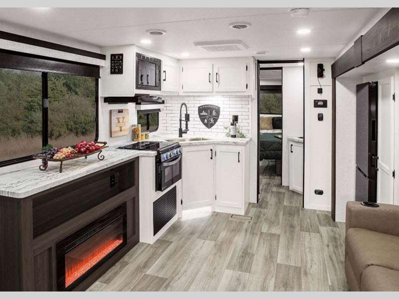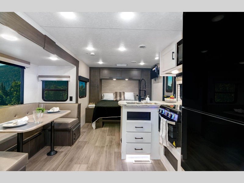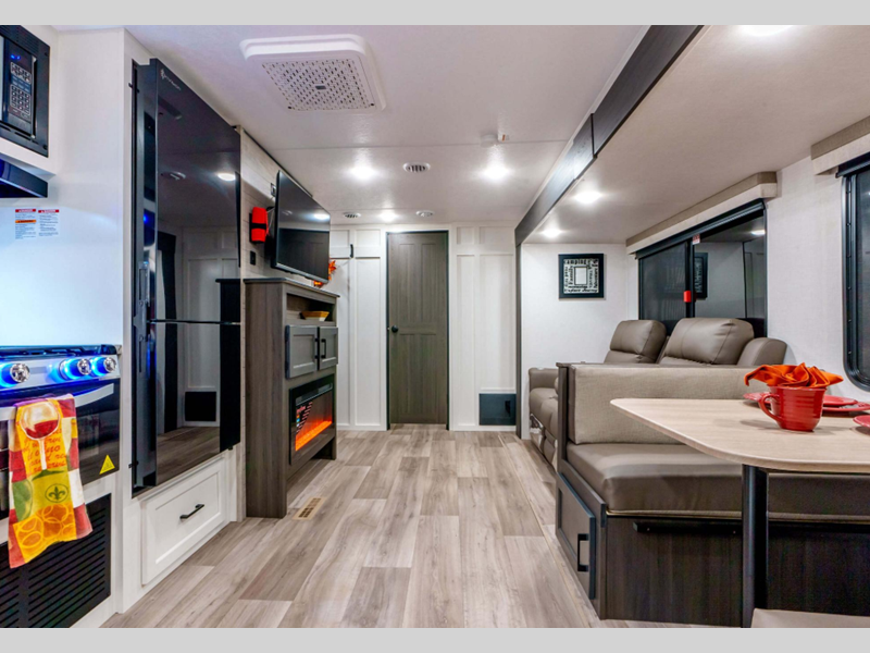 With a variety of floorplan designs and weights, these units are super light weight with exclusive technology to make setting up your RV easier so you can spend more time enjoying your outdoor activities. Their modern farmhouse design with hand glazed cabinet doors, antique white glazed cabinets, and double door 10 cu. ft. refrigerator will have you feeling right at home. Each one of the two exterior colors to choose from will turn heads at the campground!