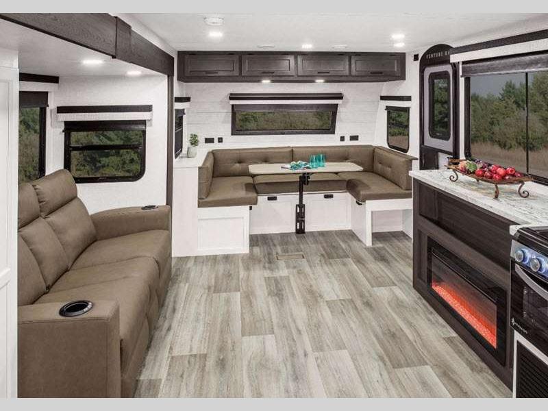The Venture RV Stratus travel trailers have it all! From an eye-catching exterior to stunning interior décor, a significant amount of storage, and a long list of handy features. They even have clever concealed spaces for organization that is out of sight like the storage bins under the dinette.